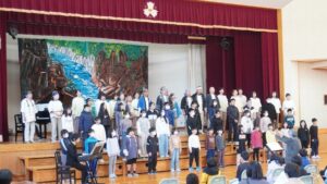 今年は11/21(金)に、飯田線開通に命をかけたアイヌの測量技師、川村カネトさんの物語「合唱劇カネト」泰阜公演を行いました。40分の短縮バージョンで行い、4,5,6年生も合唱に2曲参加しました。観劇した子どもたちは、劇や歌声のすばらしさに感動すると共に、川村カネトさんのことを知り、不屈の精神や差別について考える機会になりました。多くの保護者の方、村民の方にも参観いただきました。